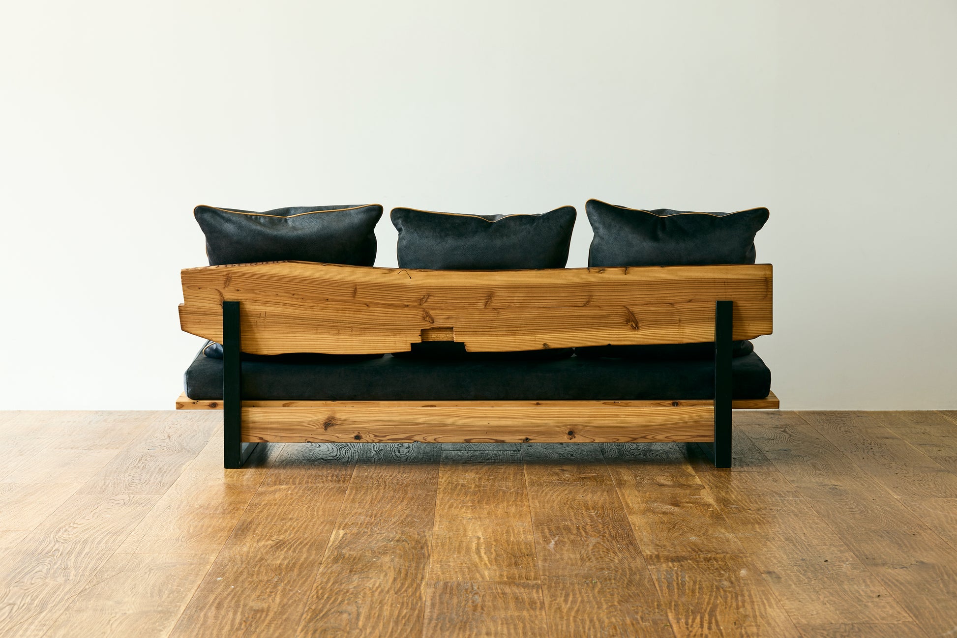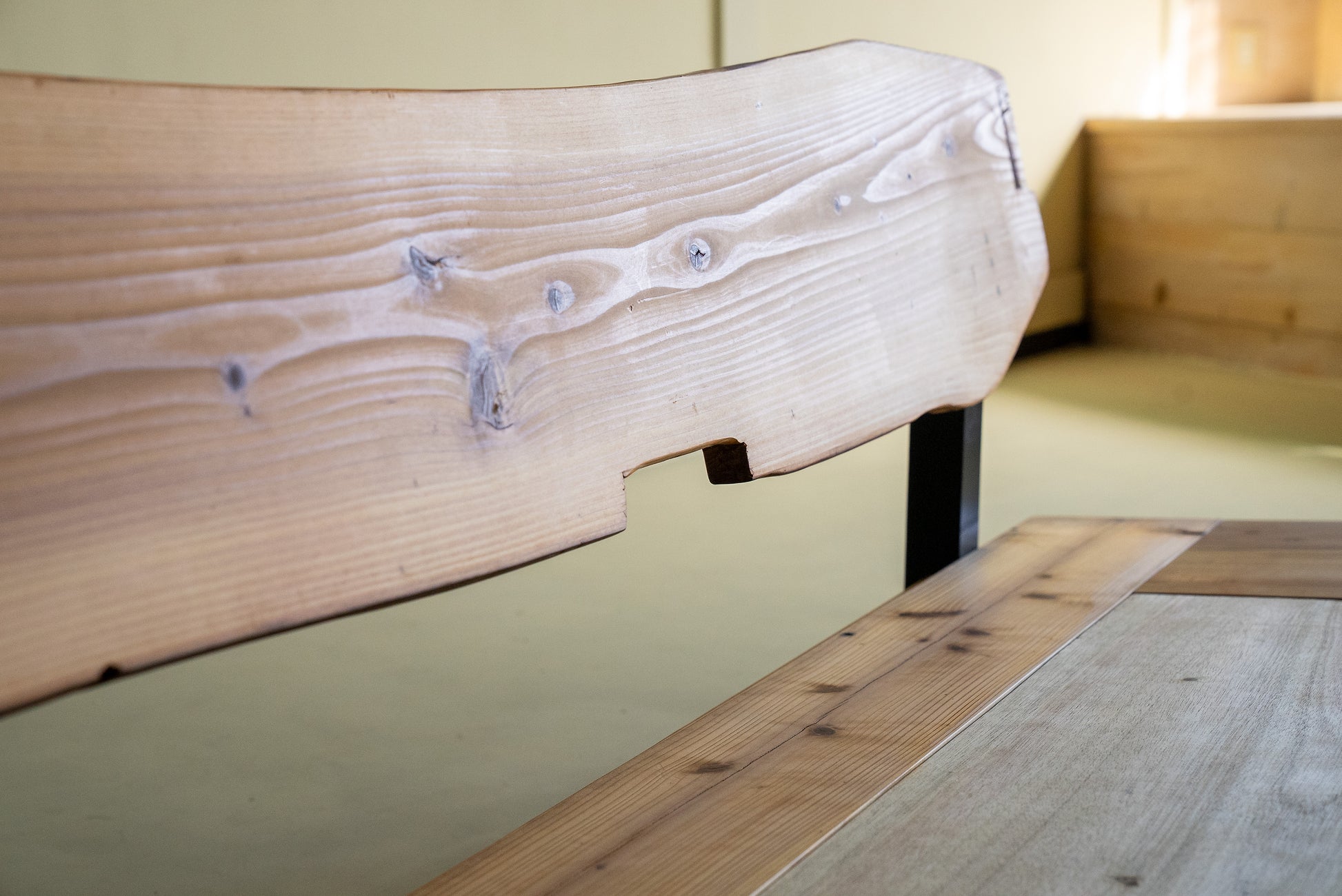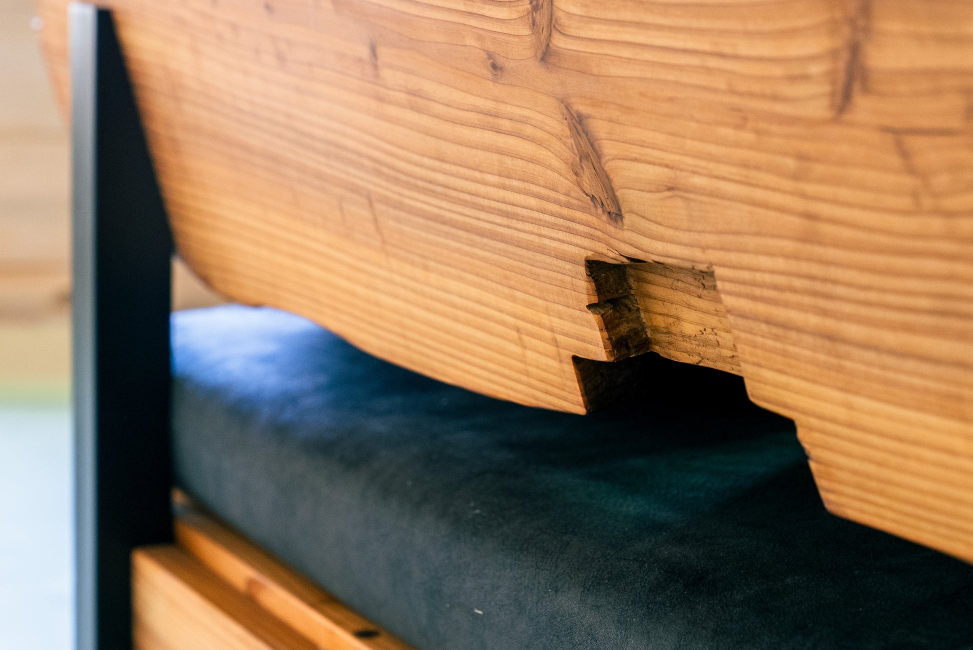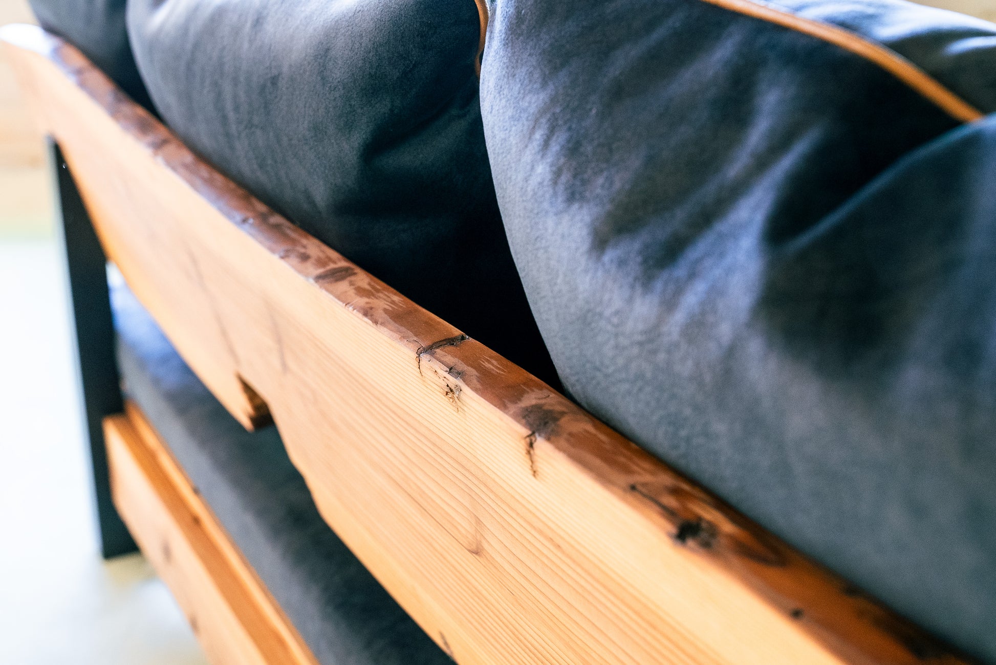 MASH-ROOMオリジナルのソファは、熊本県人吉市の豪雨災害で廃材となった家屋の梁を背もたれ部分にそのまま利用しています。ひとつひとつ木材の表情が異なり、意図的に手を加えず、柱同士を組み合わせる穴や家の建築時に職人が施した「ほぞ組」の跡などもそのまま残しています。安全性を確保しながら、素材本来の味わいや歴史を感じられるデザインです。