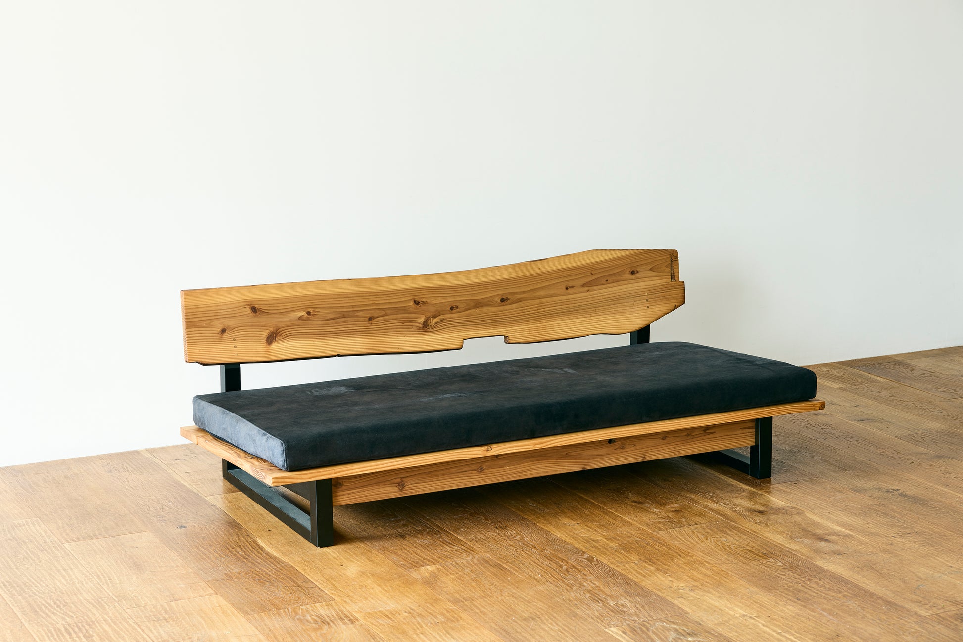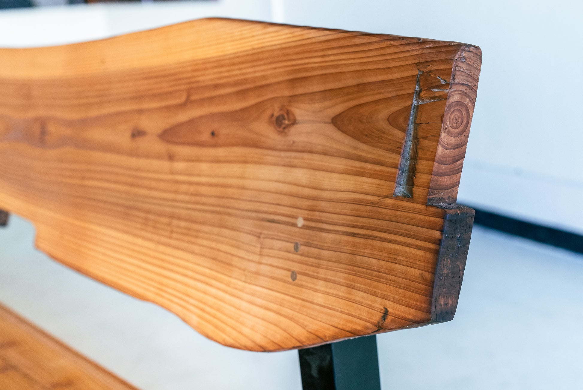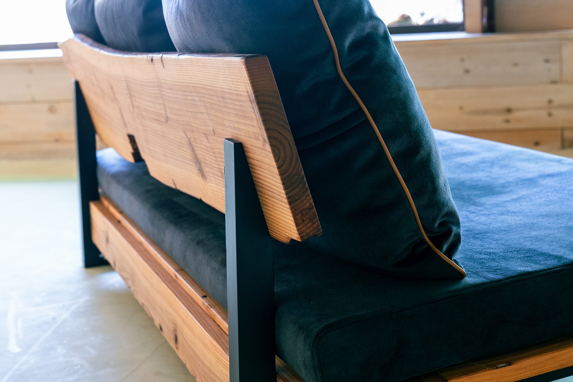 MASH-ROOMオリジナルのソファは、熊本県人吉市の豪雨災害で廃材となった家屋の梁を背もたれ部分にそのまま利用しています。ひとつひとつ木材の表情が異なり、意図的に手を加えず、柱同士を組み合わせる穴や家の建築時に職人が施した「ほぞ組」の跡などもそのまま残しています。安全性を確保しながら、素材本来の味わいや歴史を感じられるデザインです。