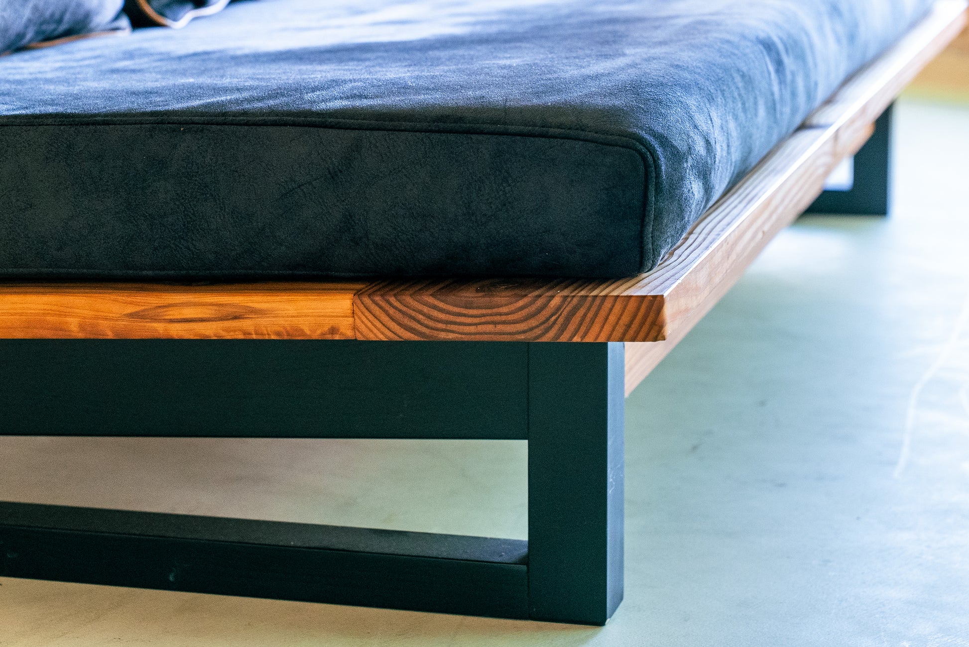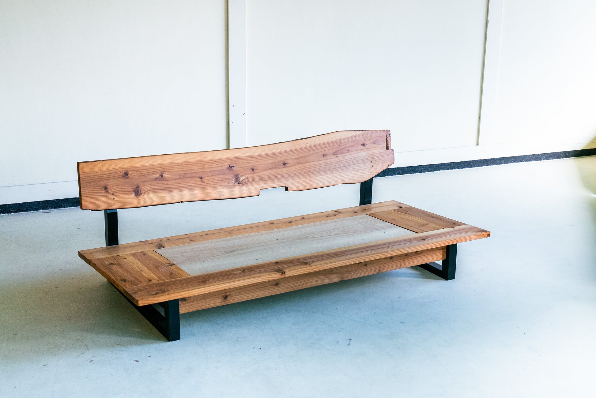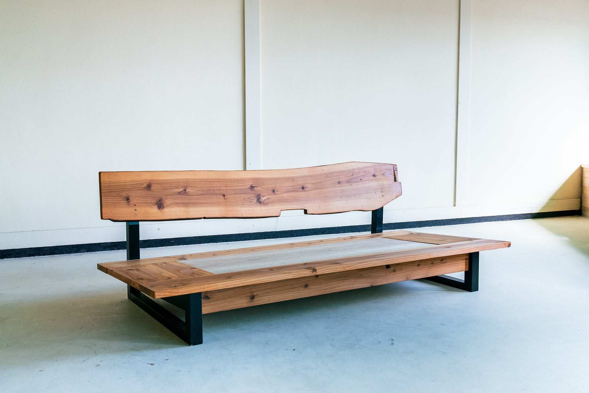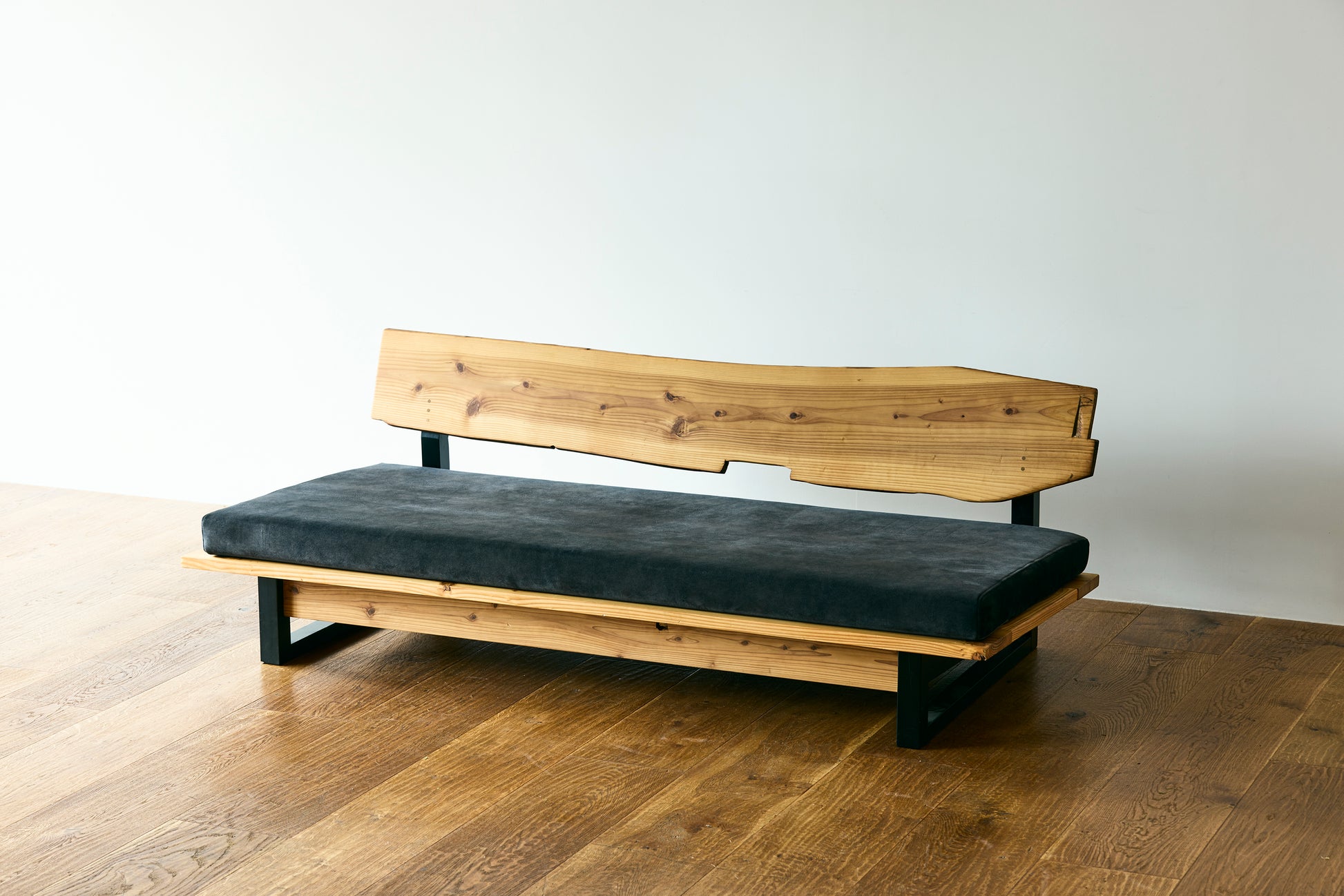MASH-ROOMオリジナルのソファは、熊本県人吉市の豪雨災害で廃材となった家屋の梁を背もたれ部分にそのまま利用しています。ひとつひとつ木材の表情が異なり、意図的に手を加えず、柱同士を組み合わせる穴や家の建築時に職人が施した「ほぞ組」の跡などもそのまま残しています。安全性を確保しながら、素材本来の味わいや歴史を感じられるデザインです。