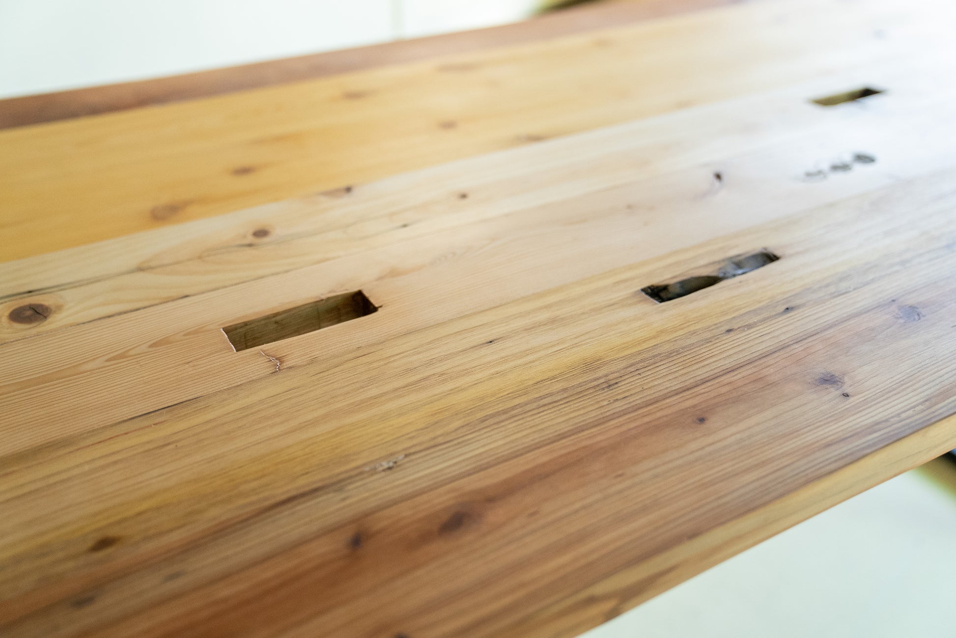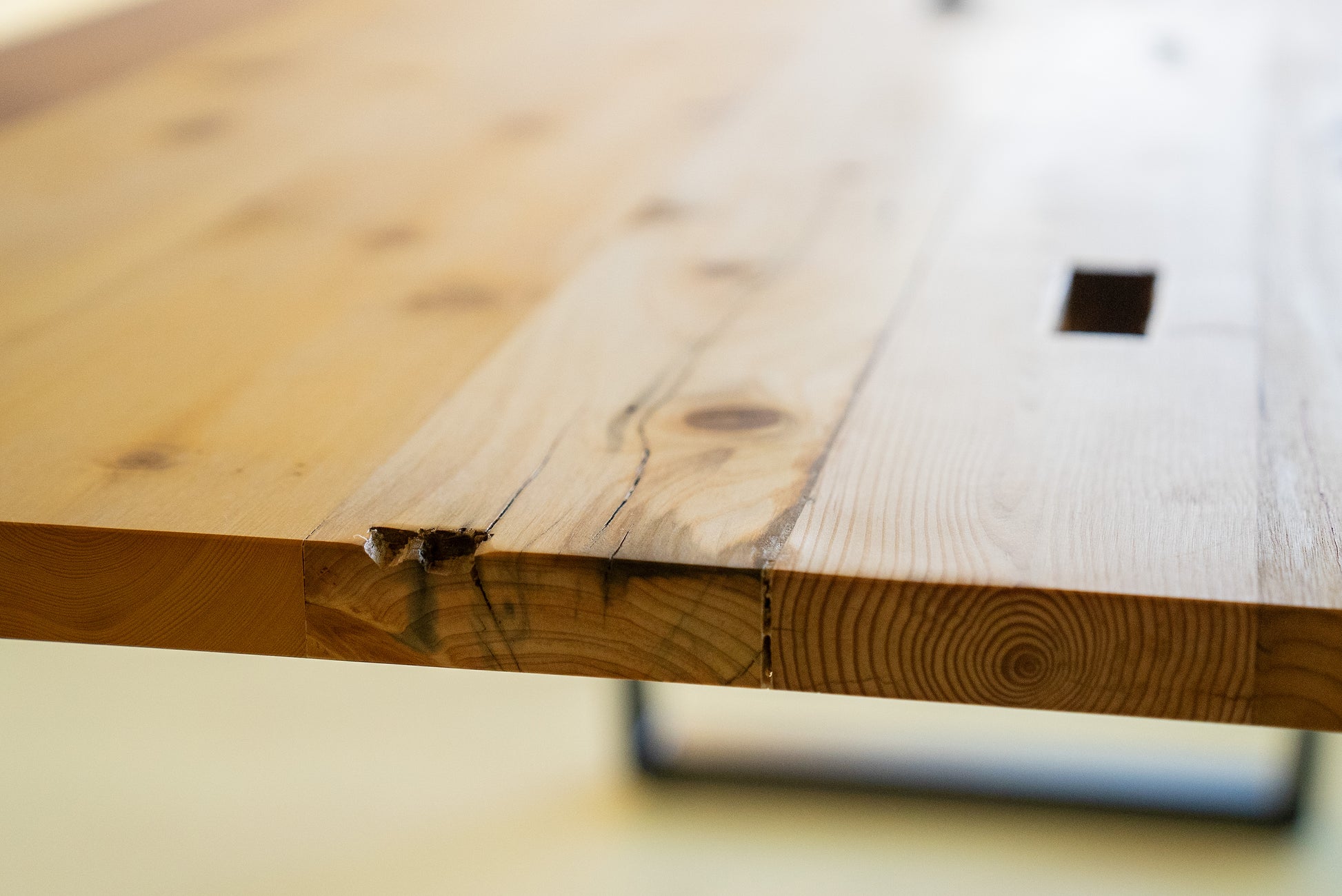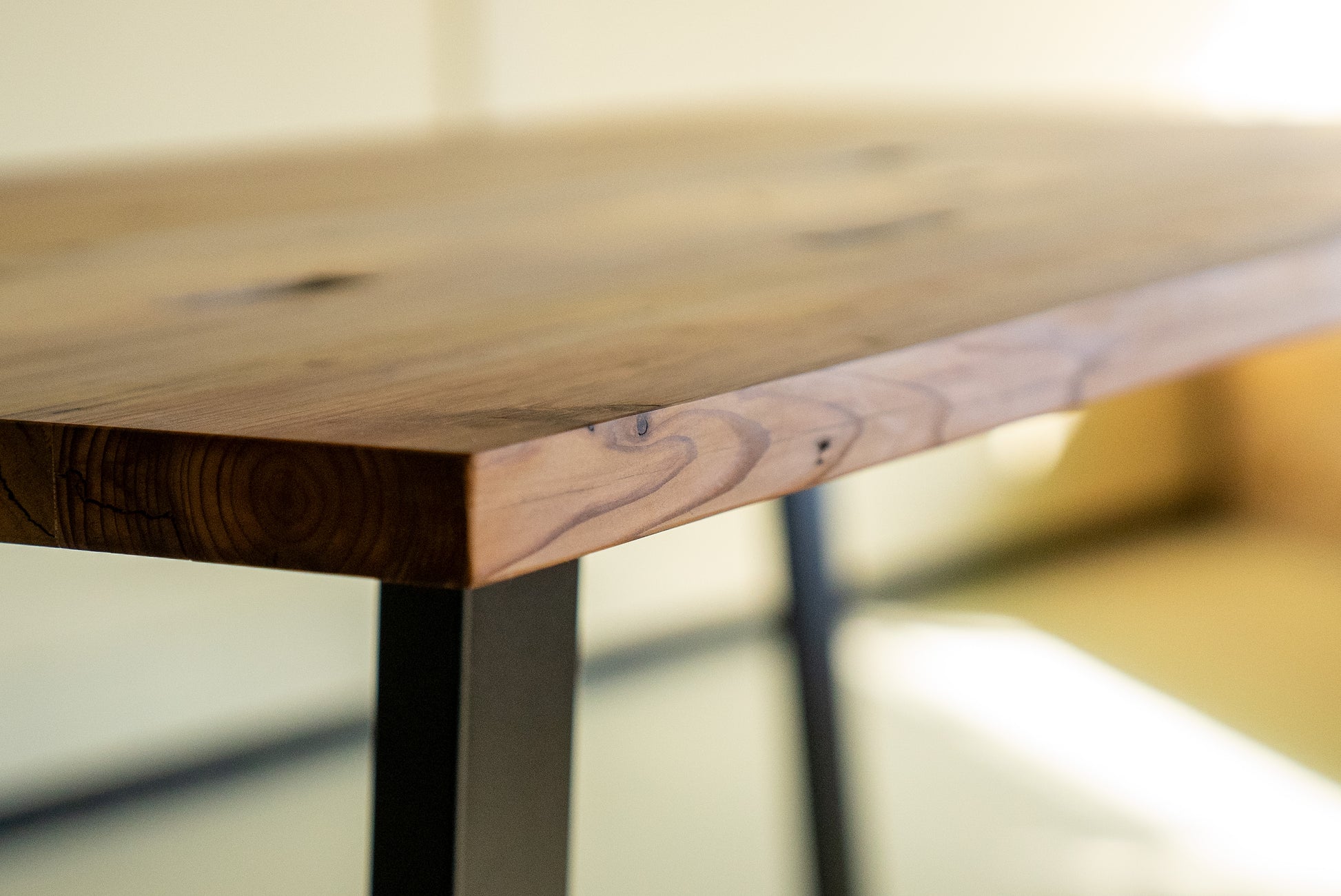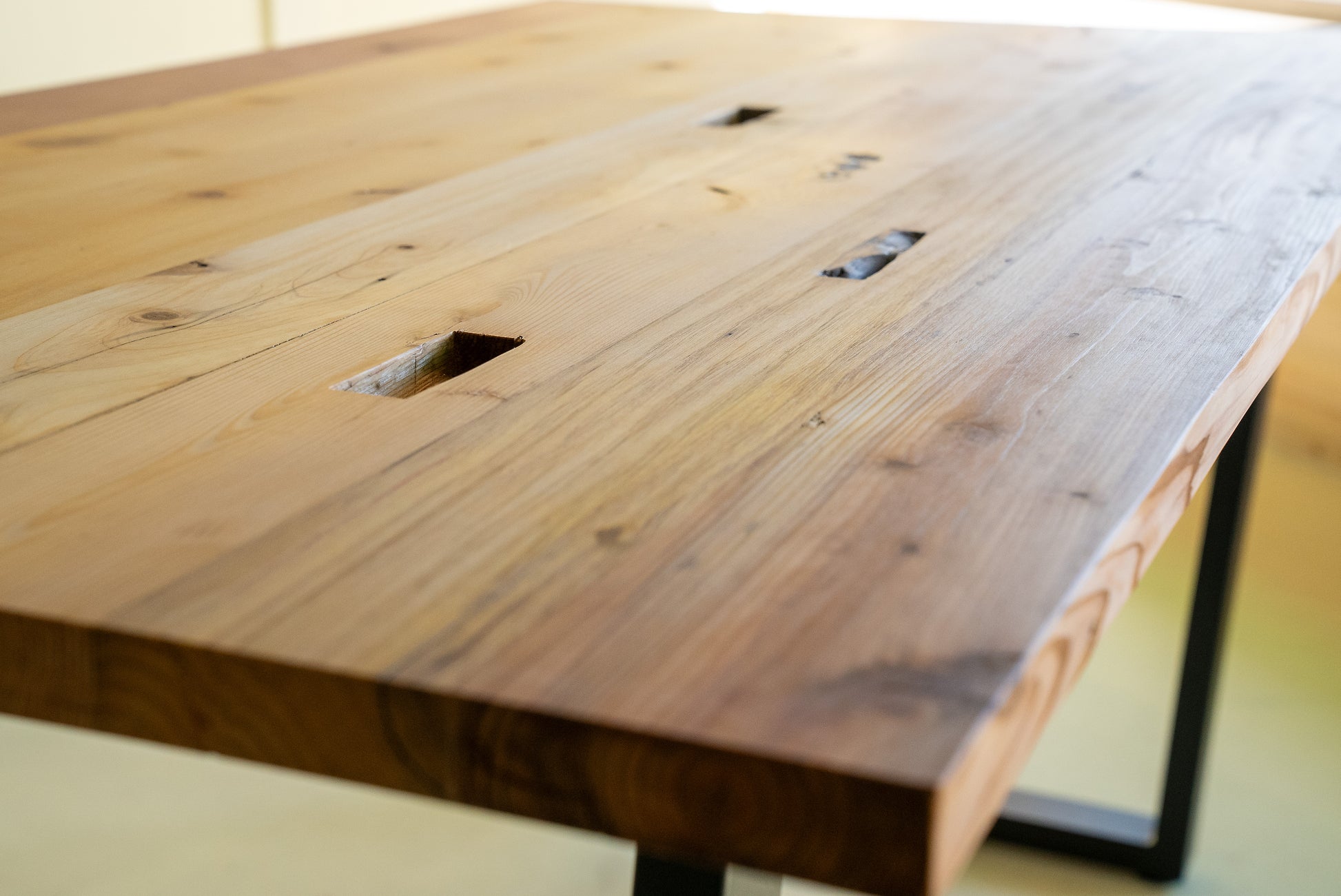 MASH-ROOMオリジナルのテーブルは、熊本県人吉市の豪雨災害で廃材となった家屋の梁や柱を天板にそのまま利用しています。素材にはあえて手を加えず、柱同士を組み合わせるための穴や、職人が施した「ほぞ組」の跡なども残しています。スチール製の脚との組み合わせによって、モダンでシャープな印象を与えつつ、天然木が持つ素朴で温かみのある風合いがバランス良く調和しています。