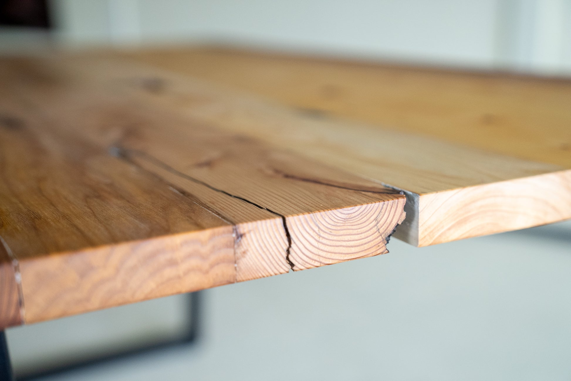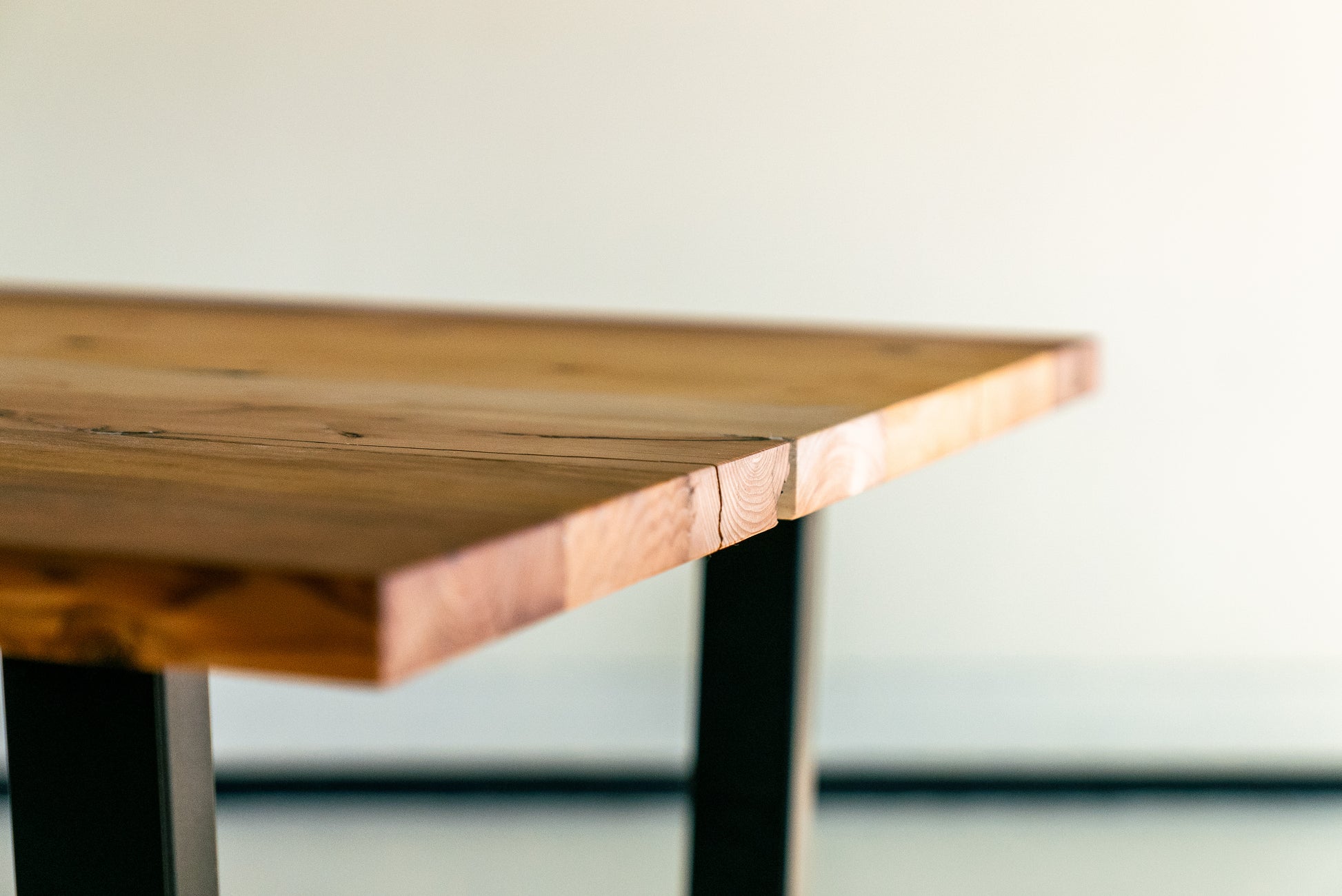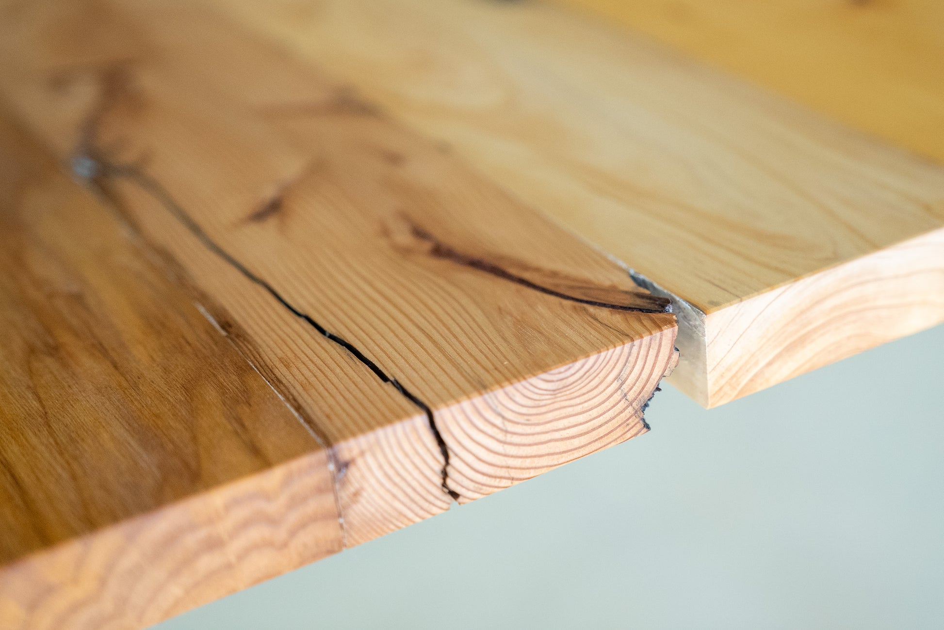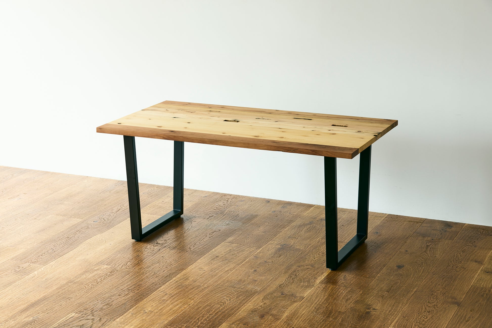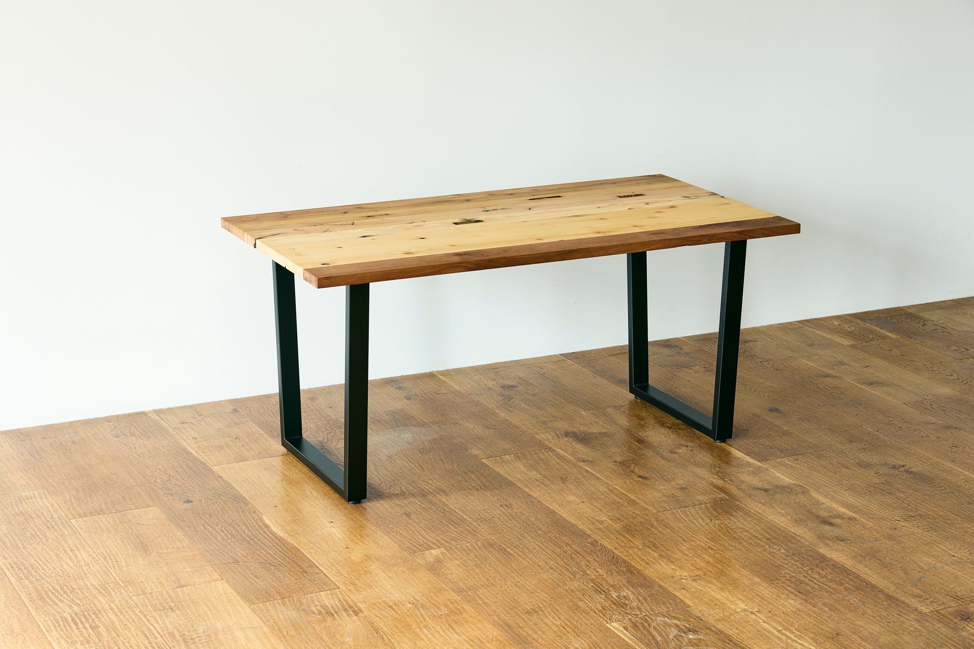MASH-ROOMオリジナルのテーブルは、熊本県人吉市の豪雨災害で廃材となった家屋の梁や柱を天板にそのまま利用しています。素材にはあえて手を加えず、柱同士を組み合わせるための穴や、職人が施した「ほぞ組」の跡なども残しています。スチール製の脚との組み合わせによって、モダンでシャープな印象を与えつつ、天然木が持つ素朴で温かみのある風合いがバランス良く調和しています。